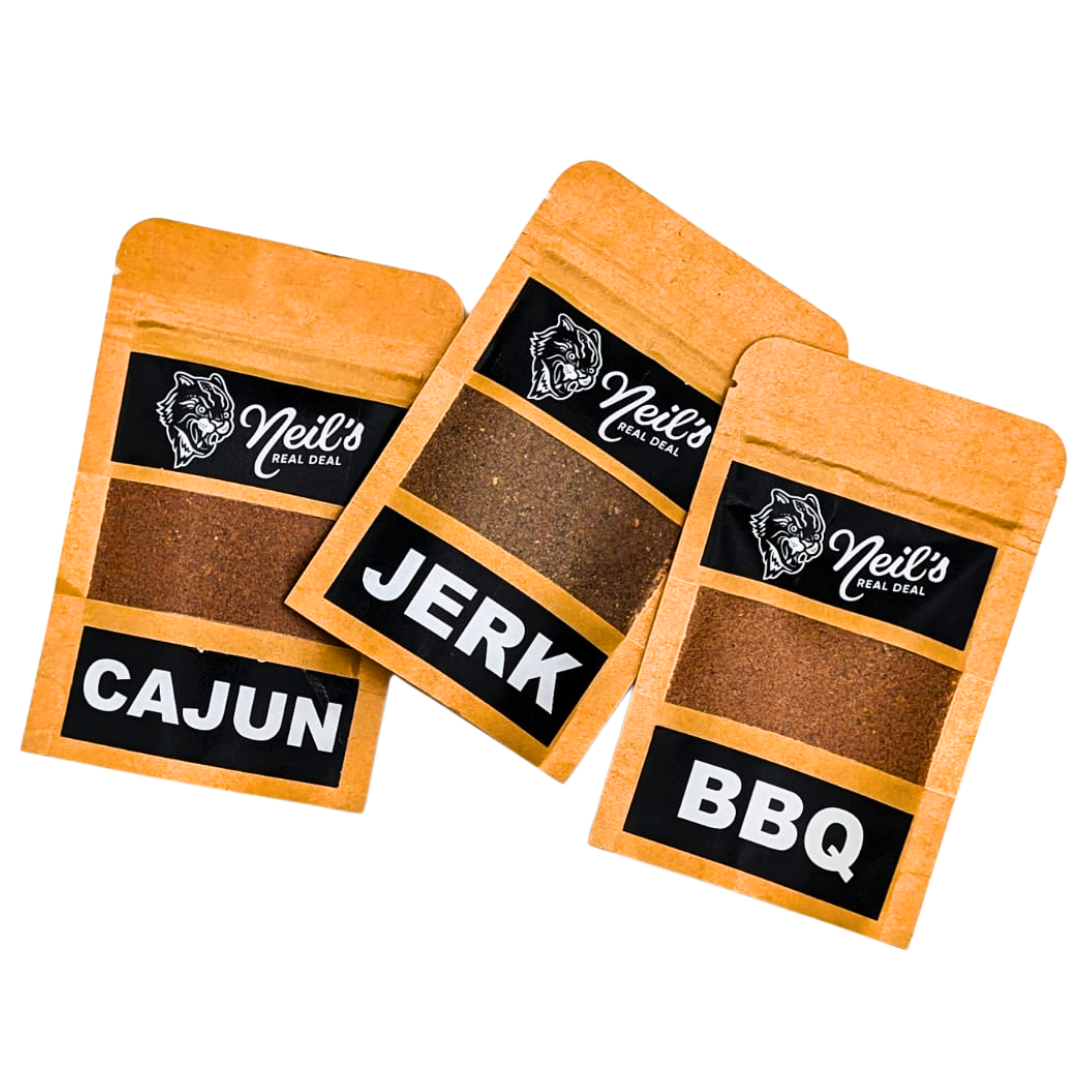 Elevate every meal with Neil’s Real Deal Rubs — bold flavours crafted to inspire your kitchen! Build your own custom 3-pack by choosing from our signature BBQ, Cajun, and Jerk rubs. Each blend is thoughtfully handcrafted using premium, all-natural ingredients to deliver authentic, unforgettable flavour.